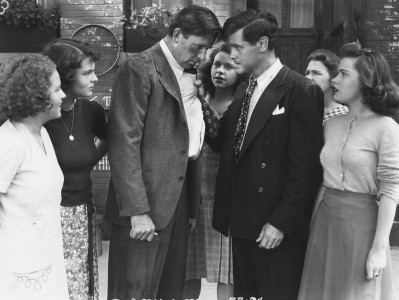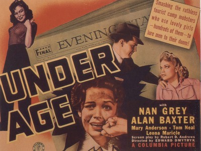 Arguably the least-known film in the filmography of the renowned noir master and future blacklist victim, Edward Dmytryk, is part of Columbia’s cycle of “girl gang” movies and deals with the twin menaces of teen hitchhiking and prostitution—if only implied. With a running time of just under an hour, it makes a gruesome spectacle of the blackmail ring operating behind a cross-country chain of roadside inns where hostesses lure in the unsuspecting male travelers. With elements that would become familiar components of many exploitation road movies, this unusually gritty B movie has sweater girls, violent car crashes and some early examples of Dmytryk’s low-key lighting, including a menacing interrogation that anticipates the director’s classic 1944 noir Murder, My Sweet.