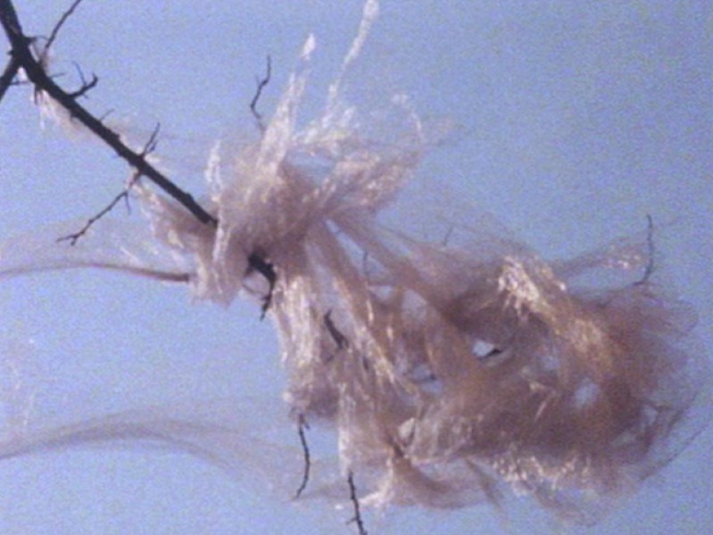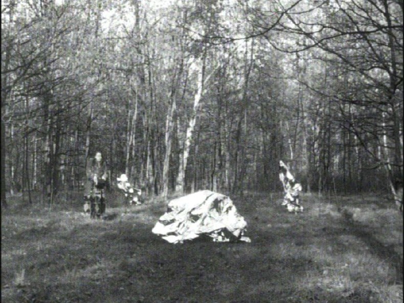 This film was produced to be included in a compilation of films against the construction of atomic bombs and nuclear powerplants. Some trees and bushes, a clearing. A young man tries to wrap himself in a foil, and a girl who sings about love accompanies herself on a children’s bandoneon. - RS